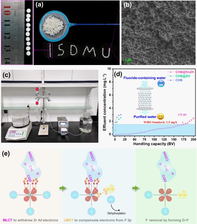針對于上述難題,環境室研發團隊提出了利用配體效應和限域模板構建毫米粒徑鋯基功能球的新策略。在殼聚糖水凝膠球中預先限域生長氫氧化鋯納米顆粒,隨后在其表面Zr位點上錨定富馬酸配體分子。研究的獨創性在于通過金屬(Zr)到配體(富馬酸)電荷轉移過程(metal-to-ligand  charge  transfer,  MLCT)使表面Zr位點發生電子離域,促使軌道能級更好匹配以及騰出更多Zr 4d空軌道促進與氟離子的F 2p軌道進行雜化,降低吸附能并形成穩固的Zr–F鍵。本研究采取的模板限域策略促進了活性點位暴露,即活性位點的“開源”;通過配體效應調制金屬位點電子密度,提高了位點活性和利用率,即活性位點“節流”;這種“開源節流”從根本上解決了傳統金屬(氫)氧化物的除氟性能和穩定性差等難題。本團隊研發的功能球在靜態、流態工況下均對含氟水展現出優異凈化能力,經處理后氟離子濃度低于世界衛生組織(WHO)規定的飲用水中氟化物濃度限值。本工作為低成本、高效的實用型除氟功能材料的開發和市場化應用奠定了重要基礎。